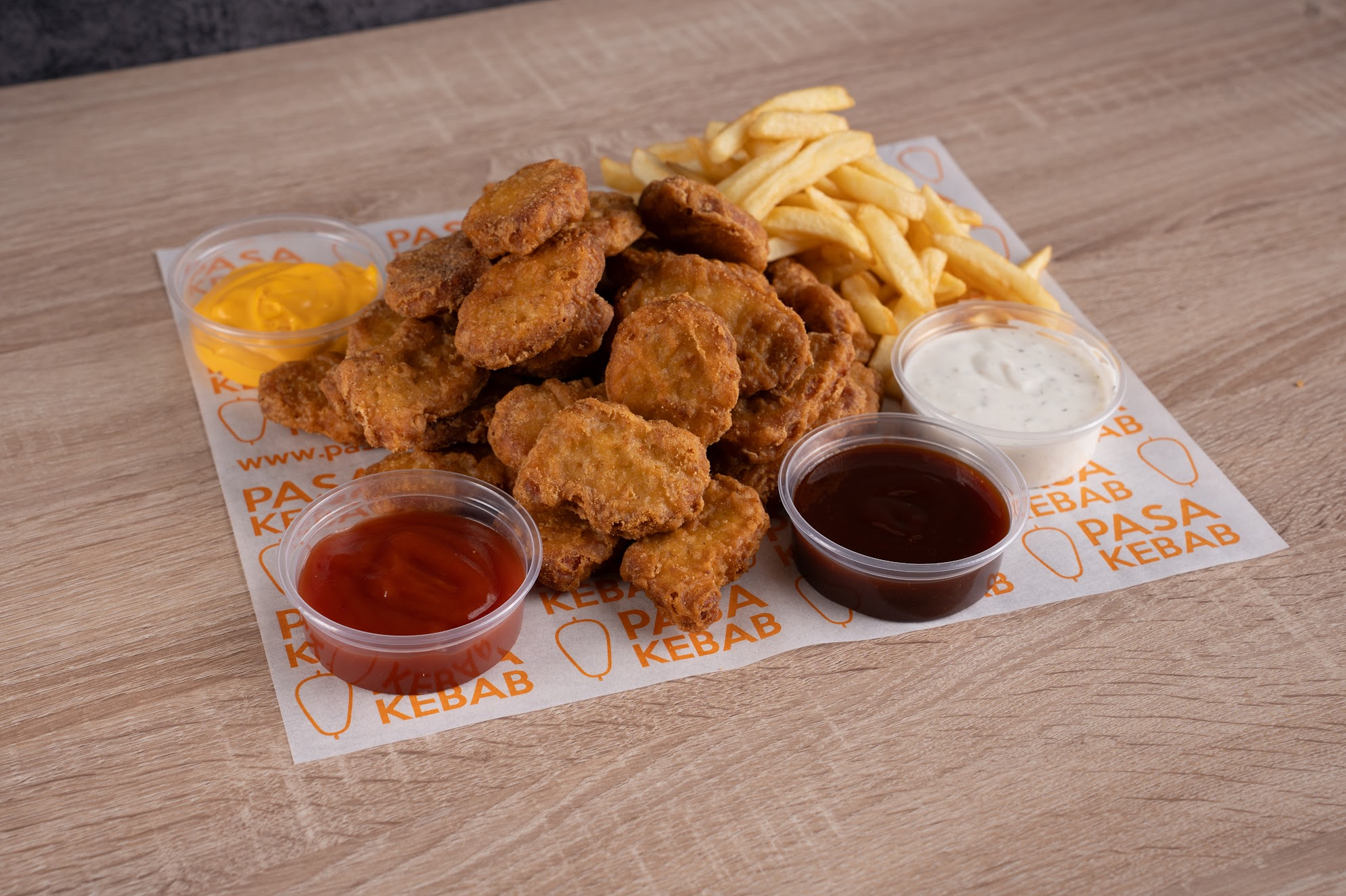 40 db ropogós-forró csirke nuggets, 4 adag hasábburgonya, 4 szósz.