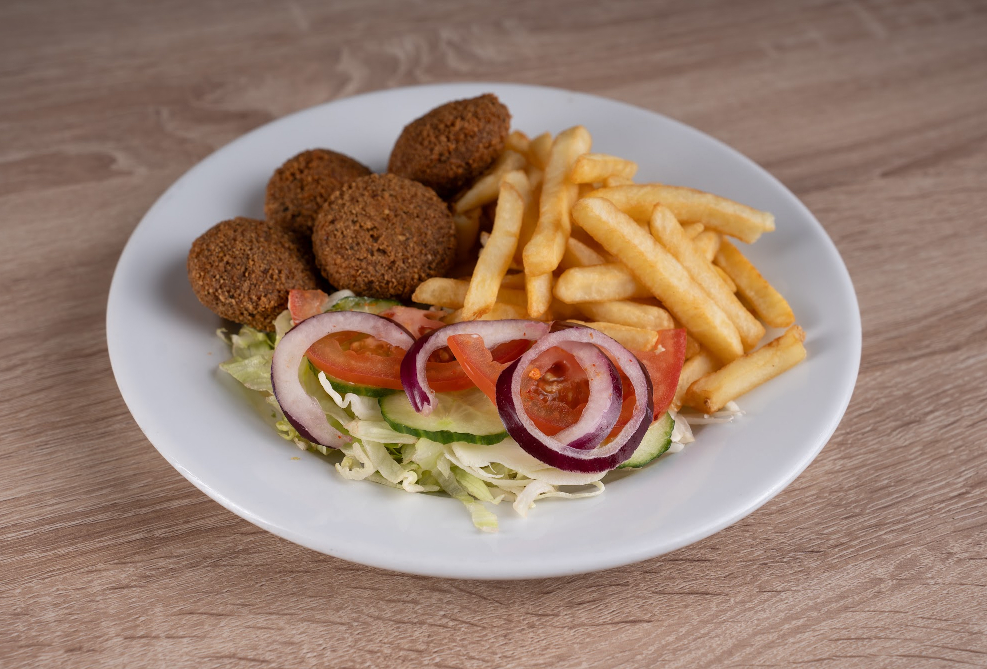 Friss,ropogós falafel körettel, speciális szósszal és friss zöldségekkel (saláta, paradicsom, káposzta, lila hagyma, uborka) tálaljuk, csípős chili paprikával fűszerezzük.
